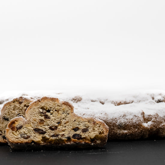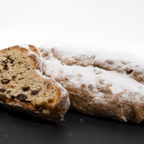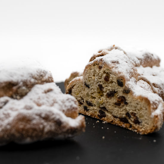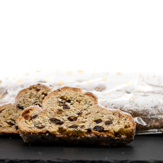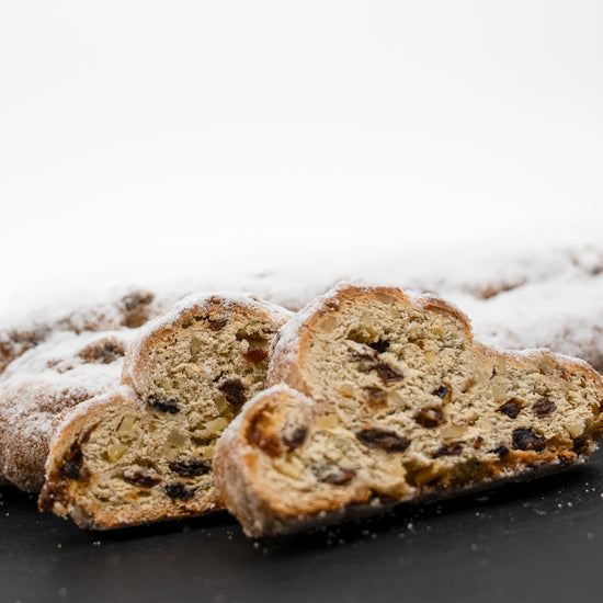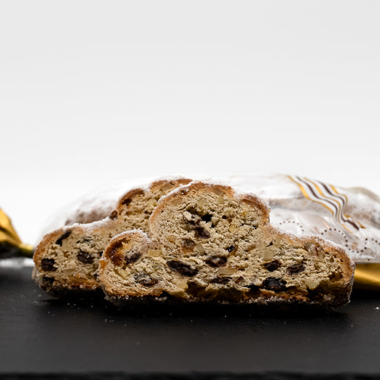 Unser Butterstollen ist ein besonders reichhaltiger Klassiker mit hohem Butteranteil und saftiger Fruchtfülle. Sultaninen, Korinthen und Mandeln verbinden sich mit feinen Zitrus- und Vanillenoten zu einem harmonischen Gesamtbild.