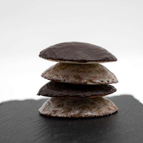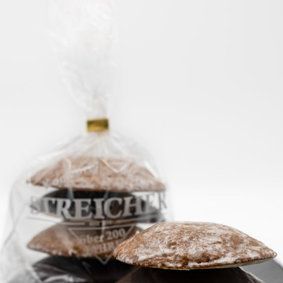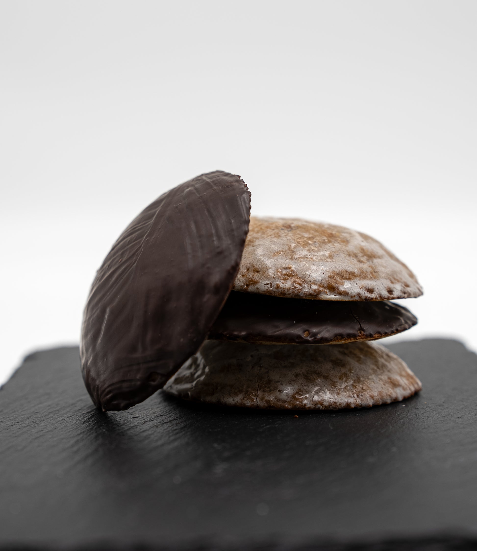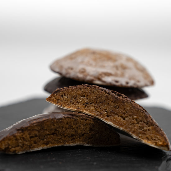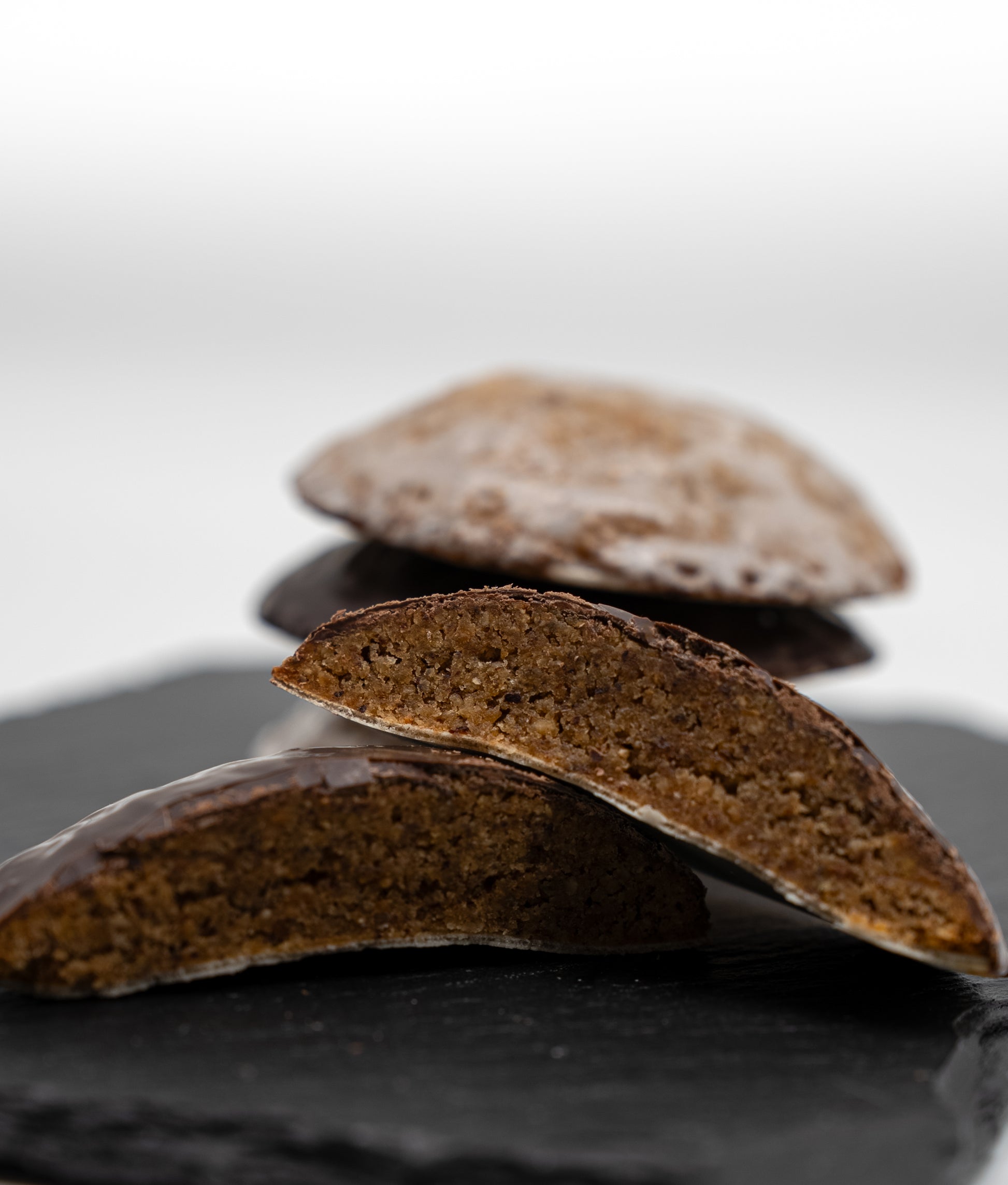 Unsere Elisenlebkuchen werden traditionell von Hand aufgestrichen und einzeln gebacken. In der Packung befinden sich vier saftige Lebkuchen zwei veredelt mit einem feinen Zartbitterüberzug und zwei mit einer dünnen Zuckerschicht überzogen. Marzipan, Honig und ausgewählte Gewürze sorgen für Tiefe und Harmonie.